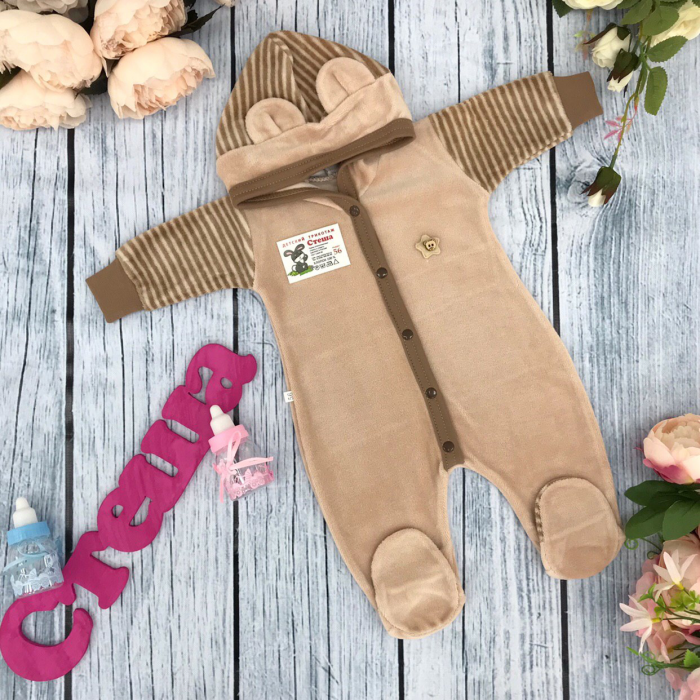 Теги: Купить велюровый комбинезон оптом от производителя. 225. Комбинезон с шапкой, 80% хлопок велюр, 20% ПЭ 56,62,68,74 цена,отзывы официальный сайт "Стеша Евпатория"