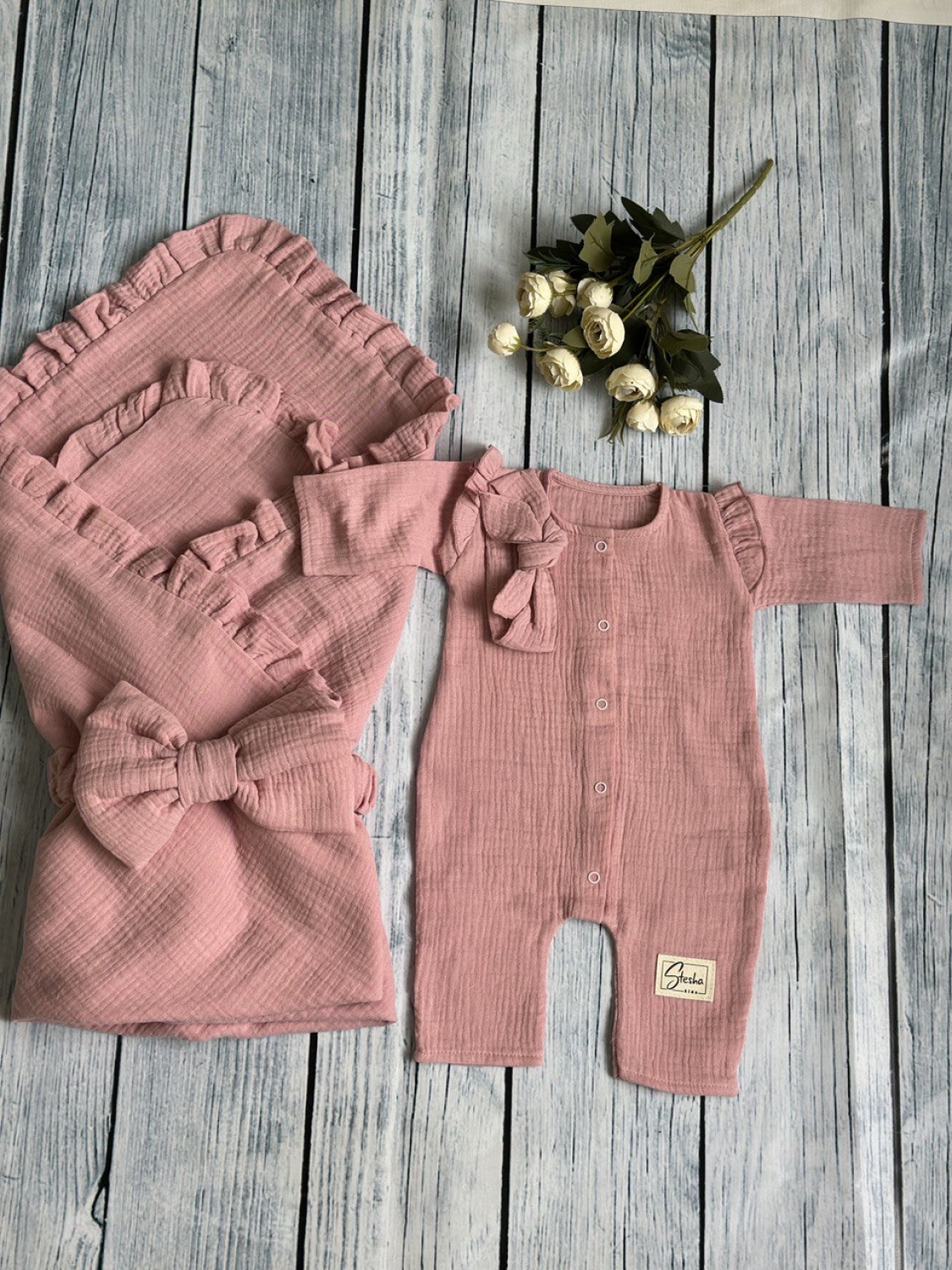 Теги: Купить детские конверты, комбинезон оптом, детские конверты на выписку оптом. 335-П. Комплект из детского комбинезона, р 56 и конверта муслин, хлопок 100% 90/90 см, пудра цена,отзывы официальный сайт "Стеша Евпатория"